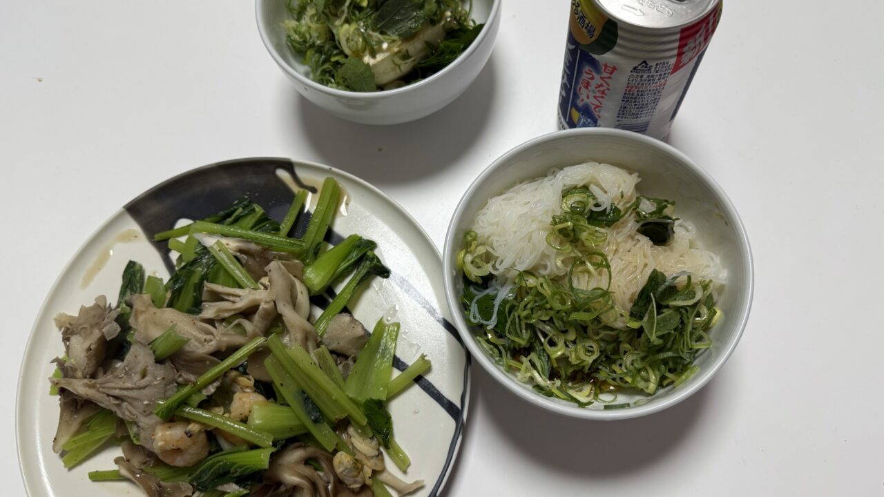 夜:シーフード野菜炒め、冷奴、こんにゃく素麺