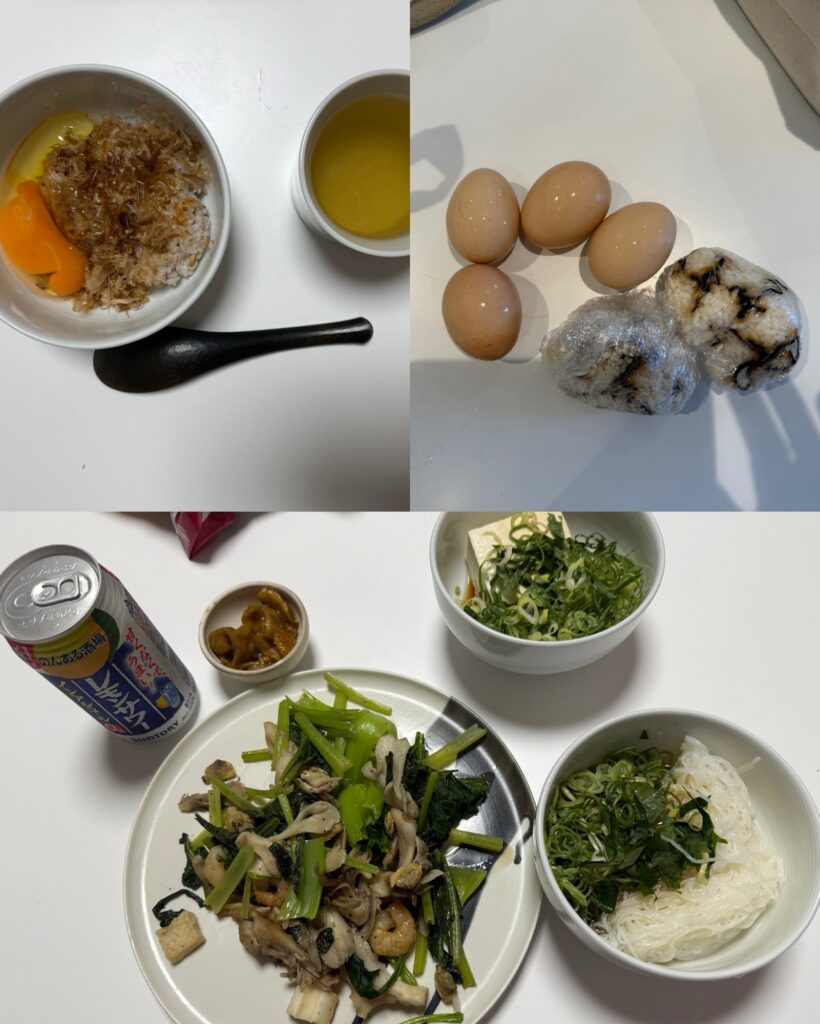 食事:朝:卵かけご飯、プロテイン、EAA(筋トレ時の飲みもの) 、くるみ餅