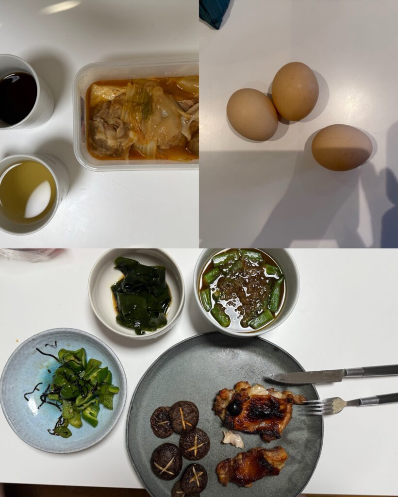 夜:鶏ももオーブン焼き半分、椎茸、オクラお浸しこんにゃく素麺、わかめ、ピーマン塩昆布炒め
