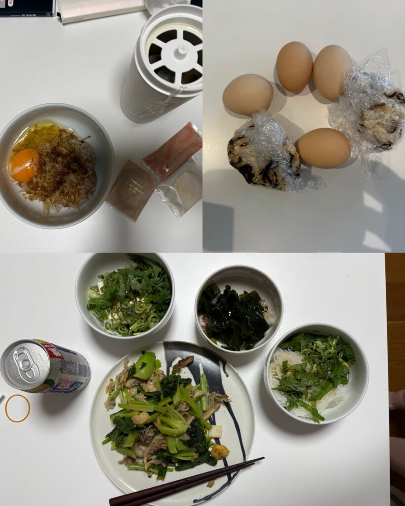 食事:朝:卵かけご飯、プロテイン、クッキー、