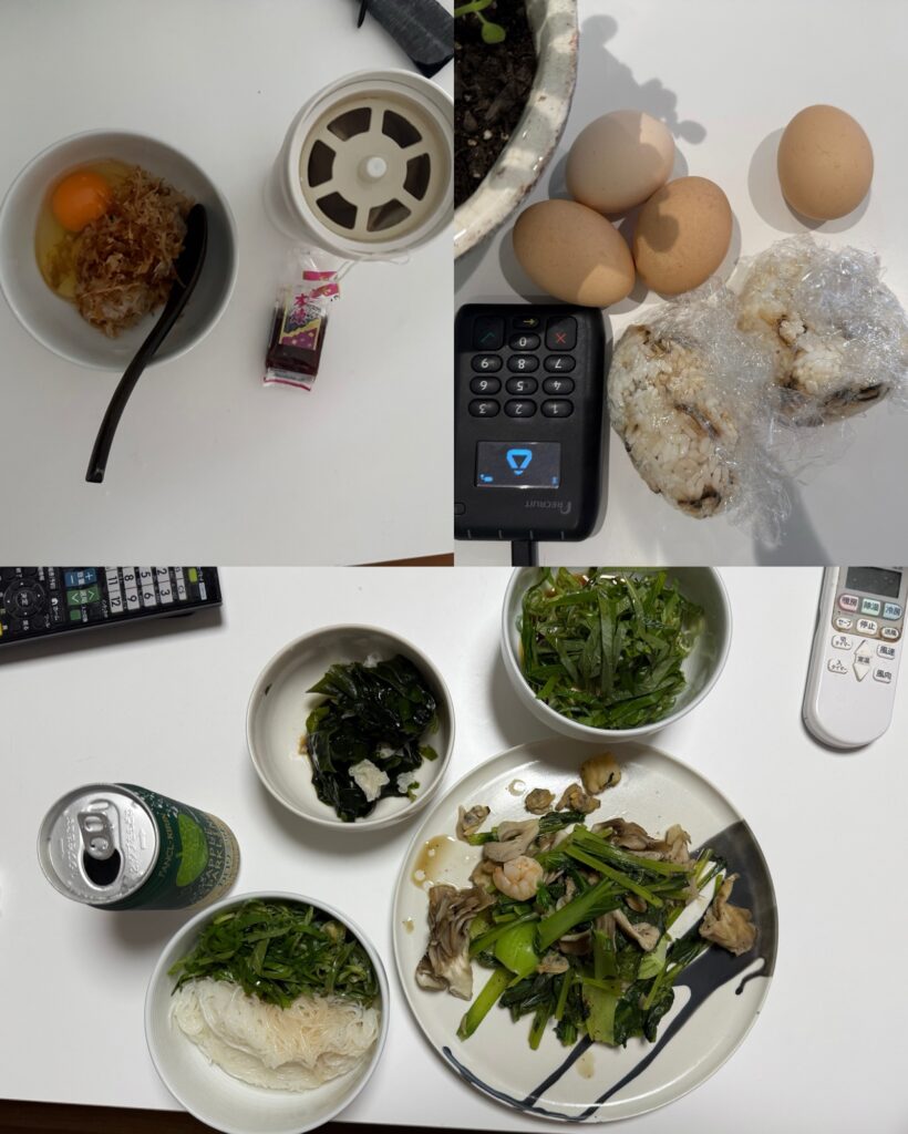 食事:朝:卵かけご飯、プロテイン、EAA(筋トレ時の飲みもの)、羊羹半分