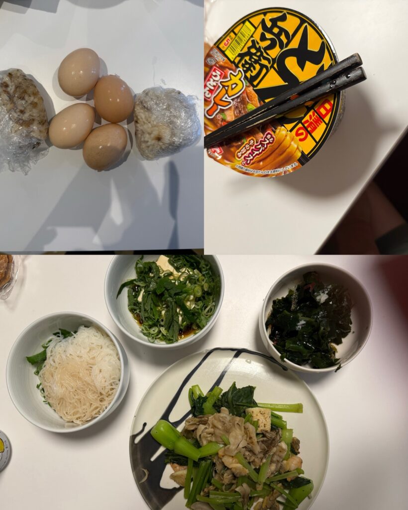 夜:シーフード野菜炒め、冷奴、こんにゃく素麺、海藻サラダ、カレーうどん一口