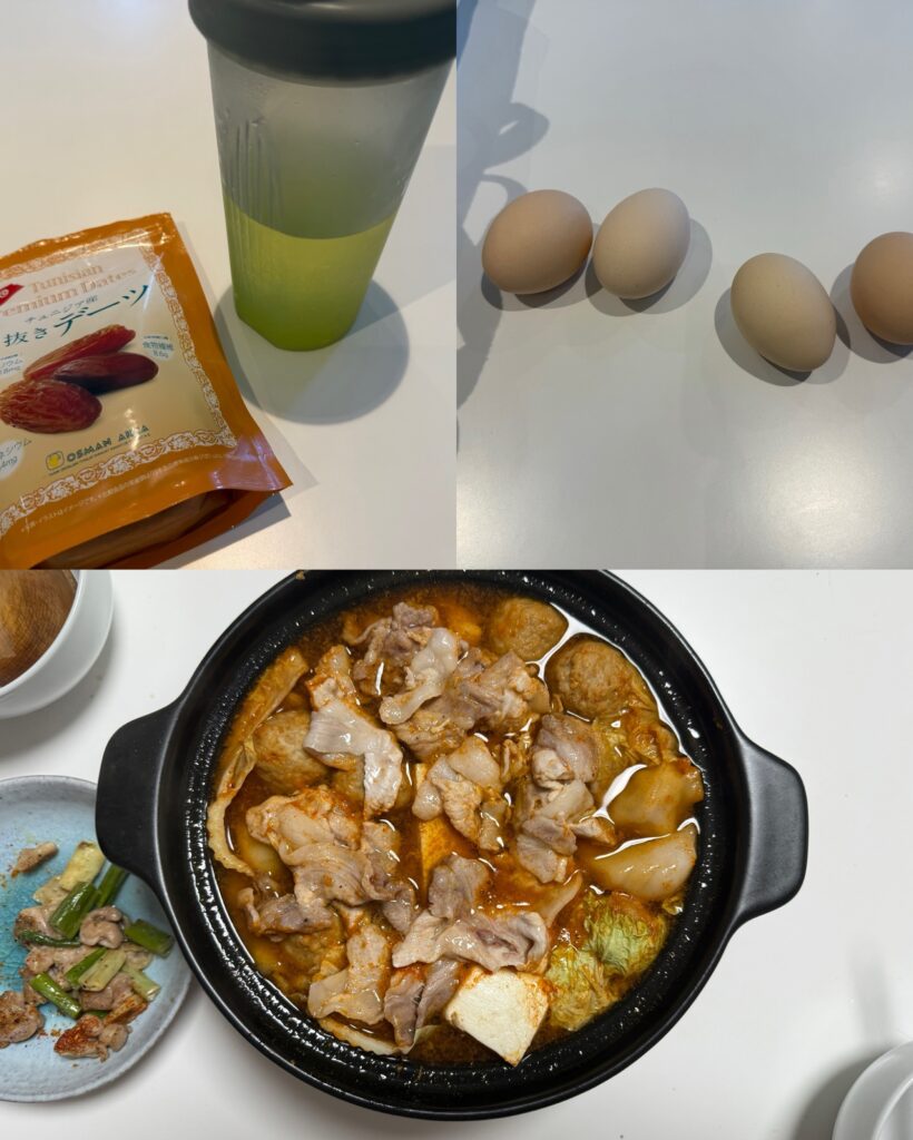 おまつダイエット [DAY35]40代からの美しく痩せる日々| omatsu 2025年10月12日 体重:56.25kg 体脂肪率:25.9% 運動:無し 便 :◯ 食事:朝:EAA、デーツ 昼:ゆで卵4個 夜 : 赤から鍋、雑炊、トリス 間食:デーツ ⸻ 明日の目標 明日は運動する! ⸻