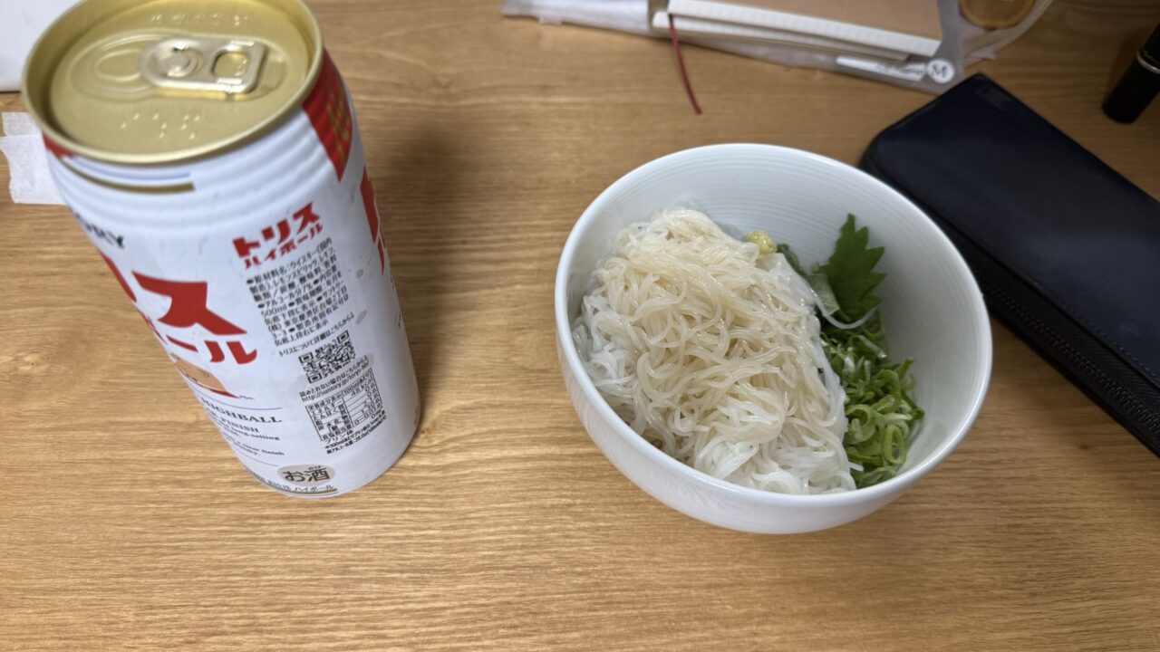夜:こんにゃく素麺、ハイボール、じゃがりこ、アイス