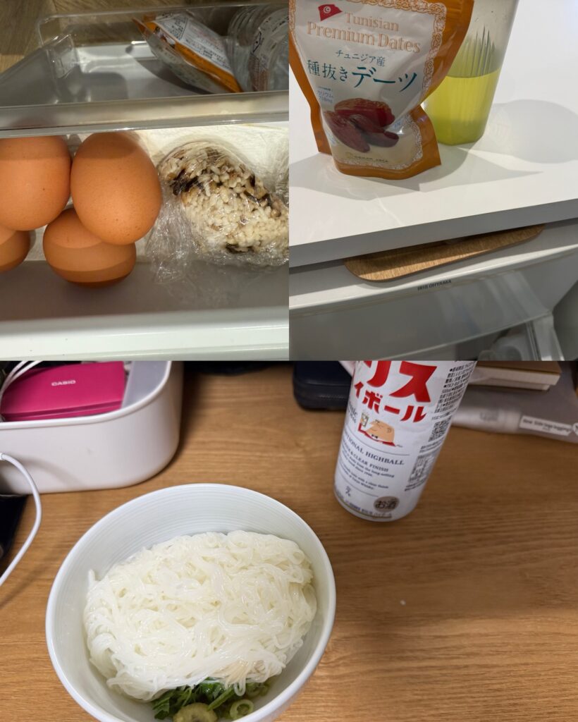夜:こんにゃく素麺、ラーメン、じゃがりこ、ハイボール